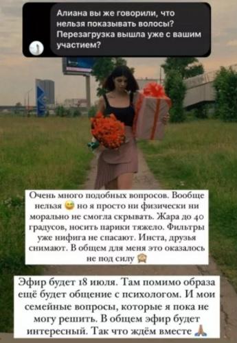 По словам Устиненко, она не смогла ничего скрыть по физическим и моральным причинам. Так, в сорокаградусную жару сложно носить парики, друзья и окружающие тоже размещают снимки с ней, поэтому ничего не удалось утаить. Недавно Алиана говорила о своем отношении к возвращению на проект бывшего супруга. Она недовольна и переживает, что из-за этого их общего сына Роберта могут «затравить» сверстники, ведь новая пассия Саши ведет себя вызывающим образом.