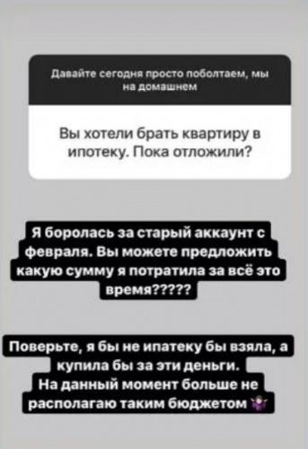 Саша снова жалуется на несправедливость и агрессию своих многочисленных хейтеров, а также на то, что её страницу заказали. По словам супруги Иосифа Оганесяна, она потратила много денег на то, чтобы сохранить свой старый аккаунт, но так ничего и не вышло. Подписчикам даже и представить сложно, сколько она потратила. Так, по её словам, она могла бы не просто ипотеку взять, а приобрести жилье, но больше она таким бюджетом не располагает. И машину на эти деньги можно было бы купить, но из-за своей лени Саша так и не прошла курсы по вождению.